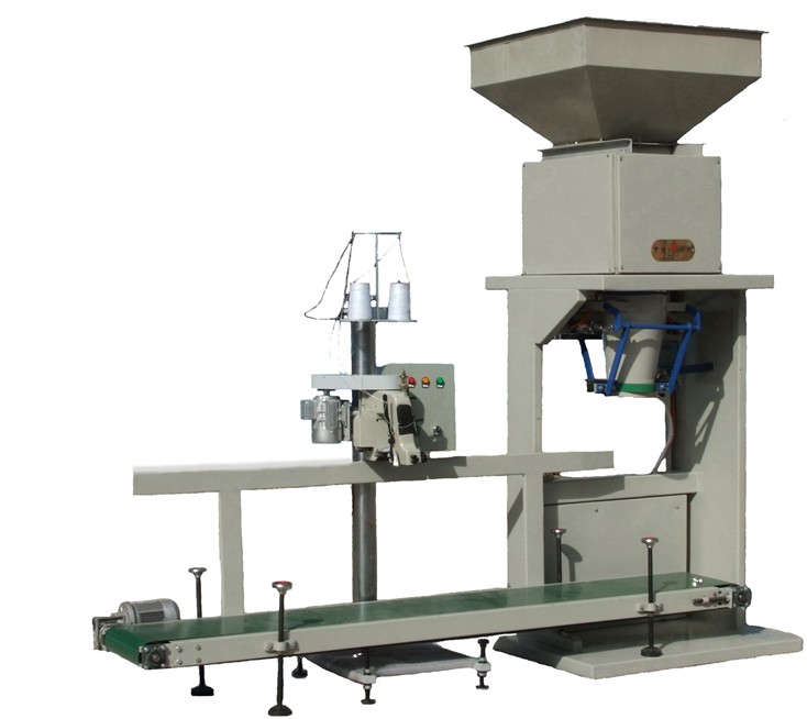 自動顆粒灌裝機使用過程:人工協(xié)助上袋,自動稱重、夾袋、充填,經(jīng)輸送帶傳遞進行自動封口或縫包