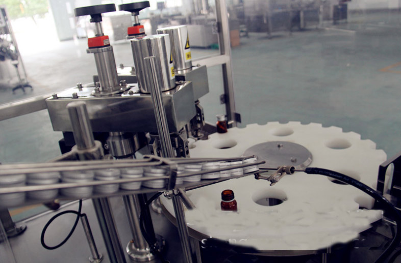 該西林瓶灌裝壓塞鎖蓋機集自動進瓶、理蓋、上蓋、抽吸真空、旋蓋、出瓶于一體,生產效率高,運行穩定可靠;西林瓶灌裝壓塞鎖蓋機的真空度可按需要設定,使用旋合式旋蓋原理和全密封真空式結構;該西林瓶灌裝壓塞鎖蓋機自動化程度高,設計合理,主要是由瓶子輸送、理蓋、夾瓶掛蓋、旋蓋、電控等機構和抽真空系統組成;此西林瓶灌裝壓塞鎖蓋機能耗低、適應性好,旋蓋機構高度可調節,適應相同口徑、不同高度的瓶子旋蓋;更換部分零件即可實現不同瓶徑、不同口徑的旋蓋,更換快捷方便;夾瓶子的托爪帶有膠墊,真空罩、旋蓋、配蓋機構都是氣缸驅動,在使用過程中都能做出精確調整,動作靈活;送蓋機構有光電感應安全保護裝置,可實現無蓋開機送蓋,蓋滿關機不送蓋;