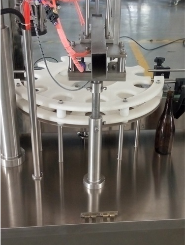7、本全自動液體灌裝壓塞鎖蓋一體機四合為一,設計特、動作可靠而且協調、同步性好,既可單機生產,又可聯入生產線中。