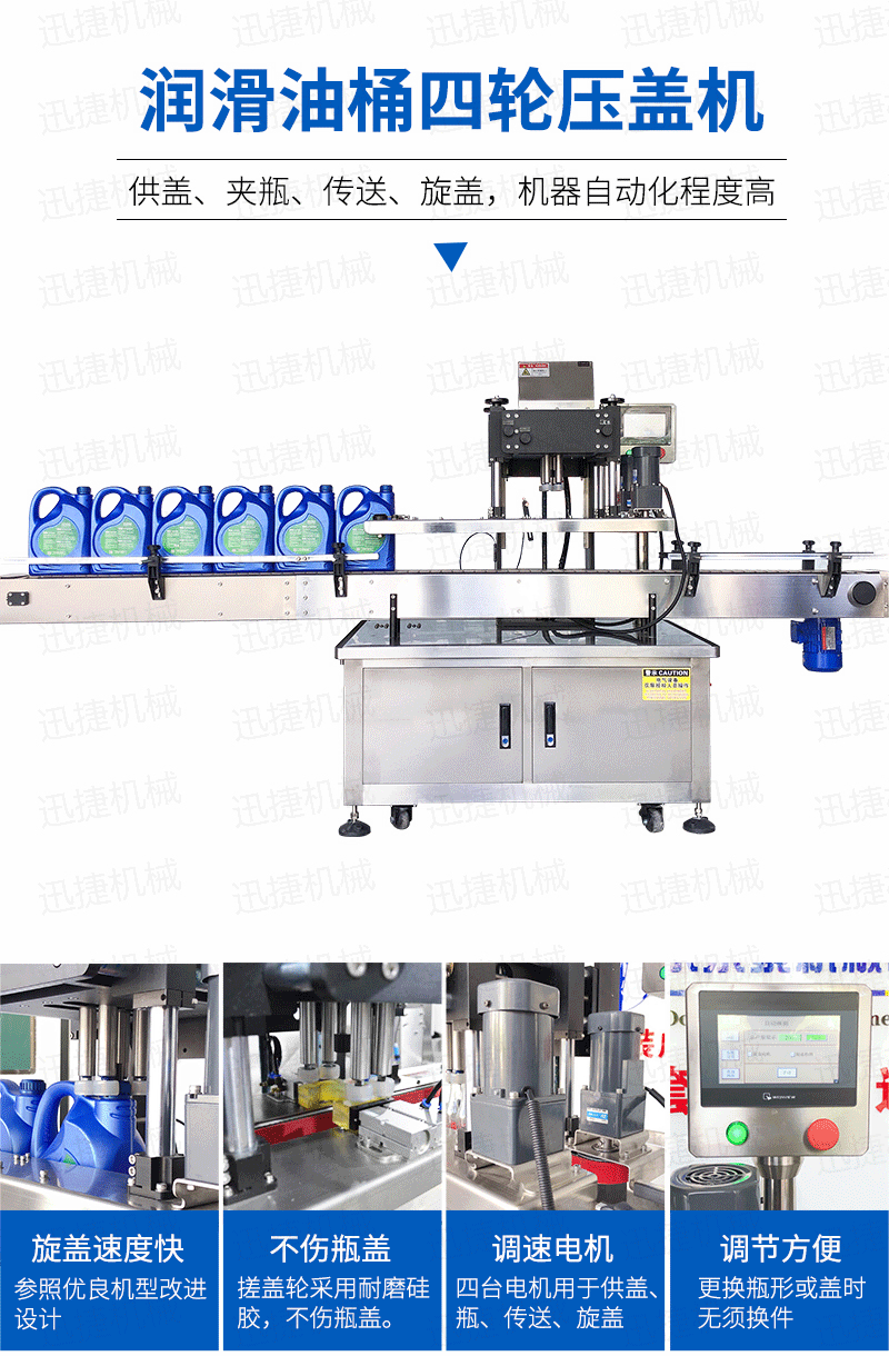 14.輸送帶變頻動力分開,灌裝機、鎖蓋機均使用單獨變頻動力頭,獨立運行,互不干擾的同時能主機觸摸屏進行共同調整,同步更準確,穩定。輸送帶的啟動和停止均有緩沖,保證輸送平穩,杜絕倒瓶,濺油現象。