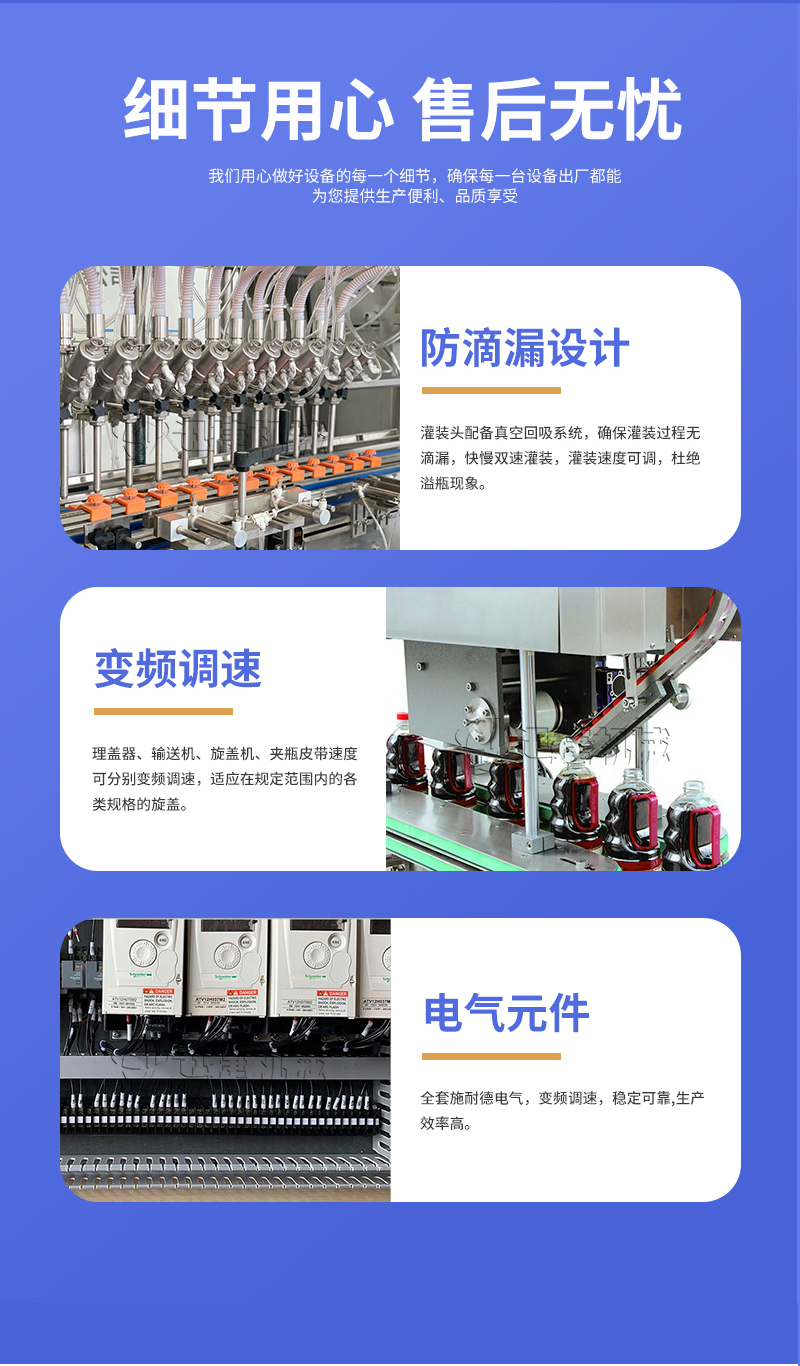 公司主要經營兩大類產品:灌裝機和包裝機。其中灌裝機主要產品有:食用油灌裝機、液體灌裝機、膏體灌裝機、自動灌裝機、全自動灌裝機、辣椒醬灌裝機等;包裝機產品有:粉劑包裝機、顆粒包裝機、液體包裝機、自動包裝機、真空包裝機等。