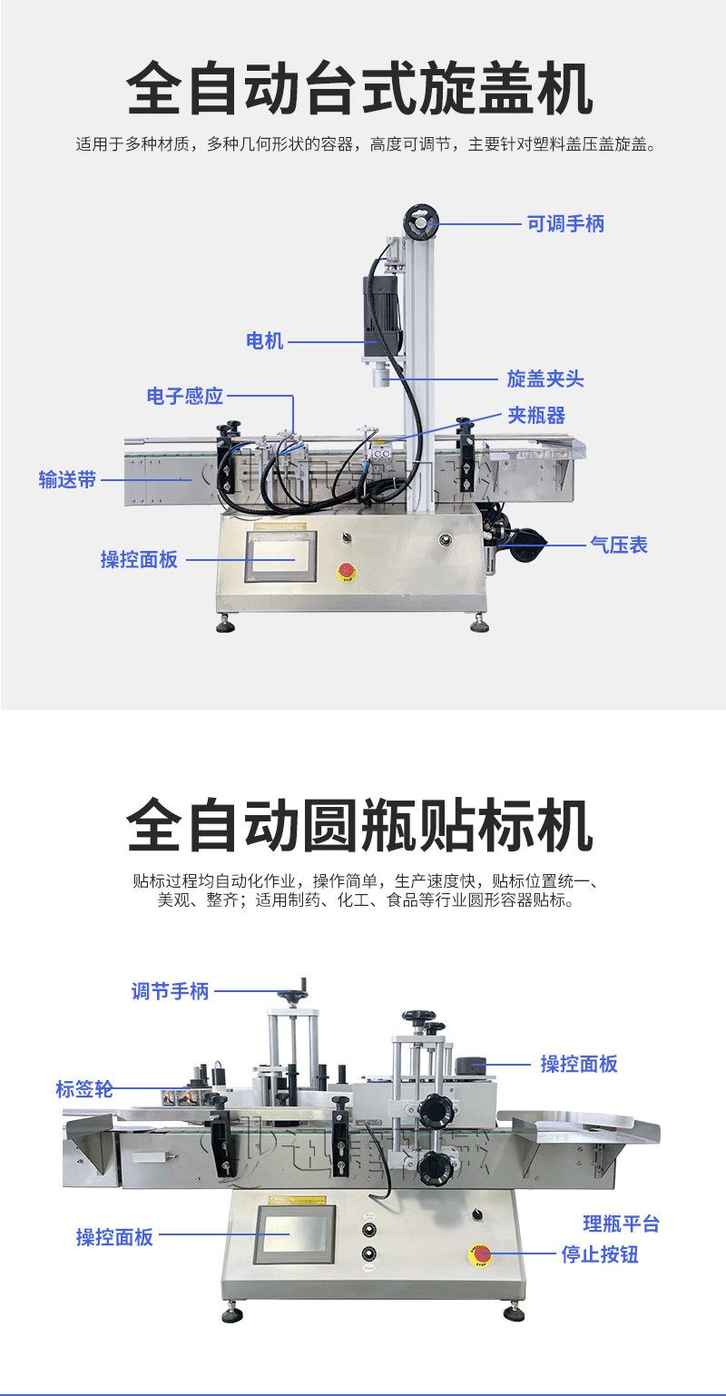 本設(shè)備主要適用于食品、日常化工、農(nóng)藥、醫(yī)藥和特殊行業(yè)。灌裝精度將受氣壓的穩(wěn)定性、物料的均勻性、灌裝速度等的影響。 產(chǎn)品說明:生產(chǎn)線根據(jù)灌裝范圍選擇型號(hào),灌裝部分為雙頭下潛式灌裝機(jī),適用于不同物料不同瓶子的灌裝,配備自動(dòng)壓蓋機(jī)和圓瓶貼標(biāo)機(jī),可實(shí)現(xiàn)不同蓋子的旋蓋貼標(biāo)工作。